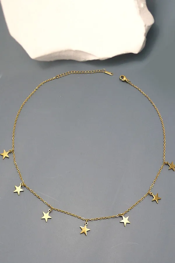 18K Stainless Steel Non-Tarnish Station of Drop Star Necklace, a stunning piece of jewelry designed to dazzle and endure. Crafted from premium stainless steel with an exquisite 18K gold finish, this necklace features a series of delicate star-shaped pendants suspended along the chain.