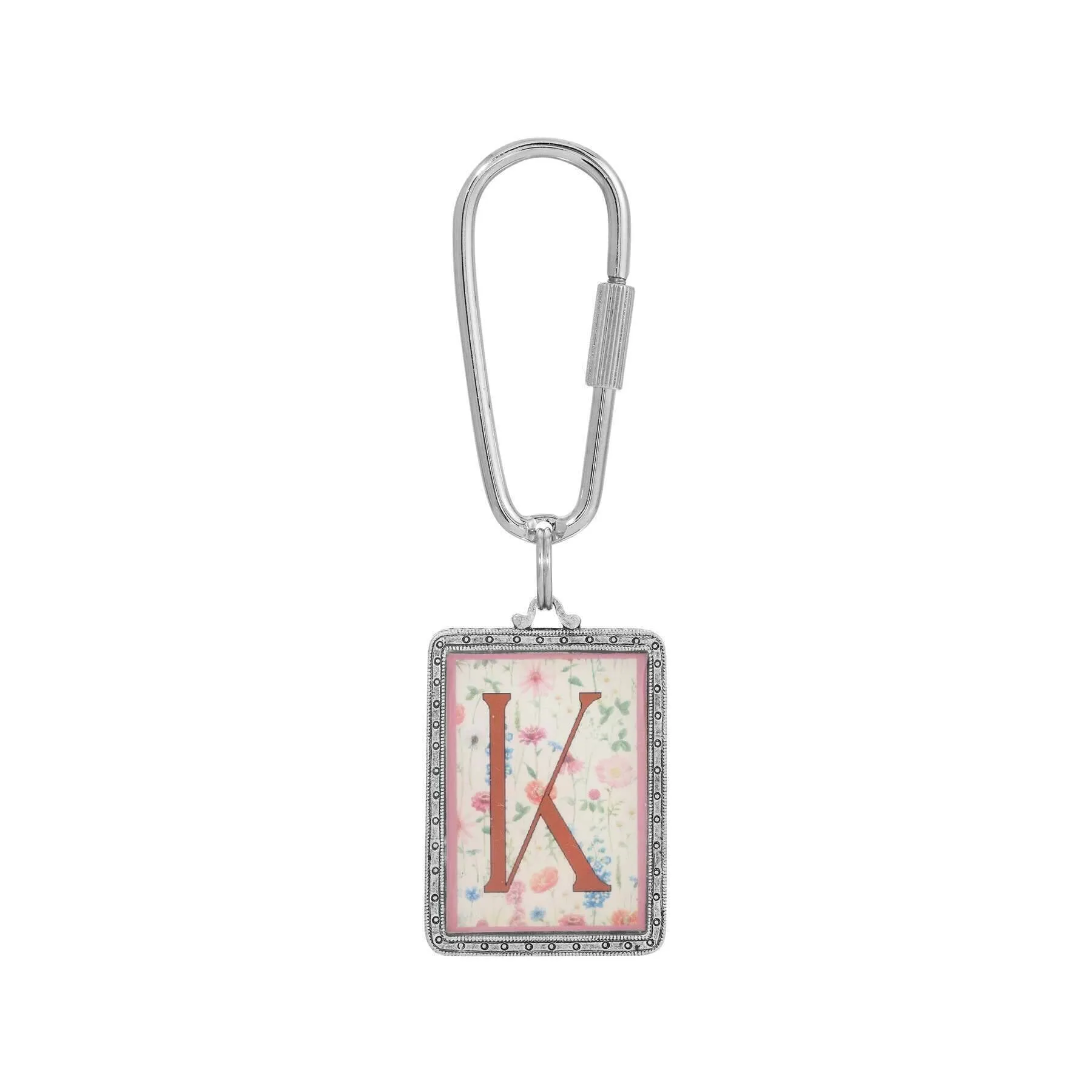 For the vintage enthusiasts who has it all, we've created this special initial key chain featuring a rectangular antiqued frame with a beautiful pink and blue flower decal with a classic letter at the center. The key chain is designed with an easy to use screw lock.