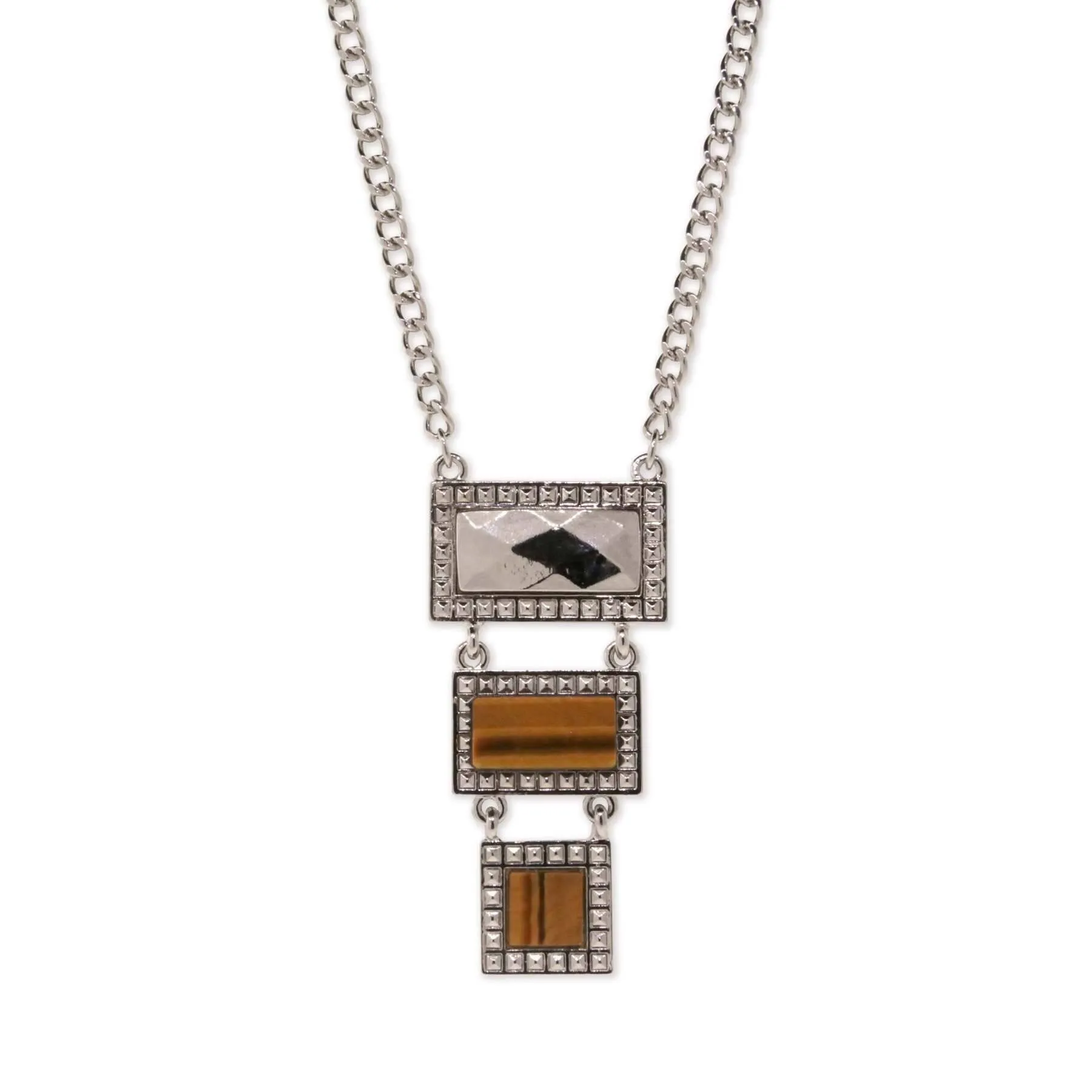 Accentuate your neckline with the fabulous look of this exotic statement necklace. Fashionably created by 1928 Jewelry, this square and rectangular cut tigers eye stone set on silver tone mixed metal frame and rectangular link delivers the style.