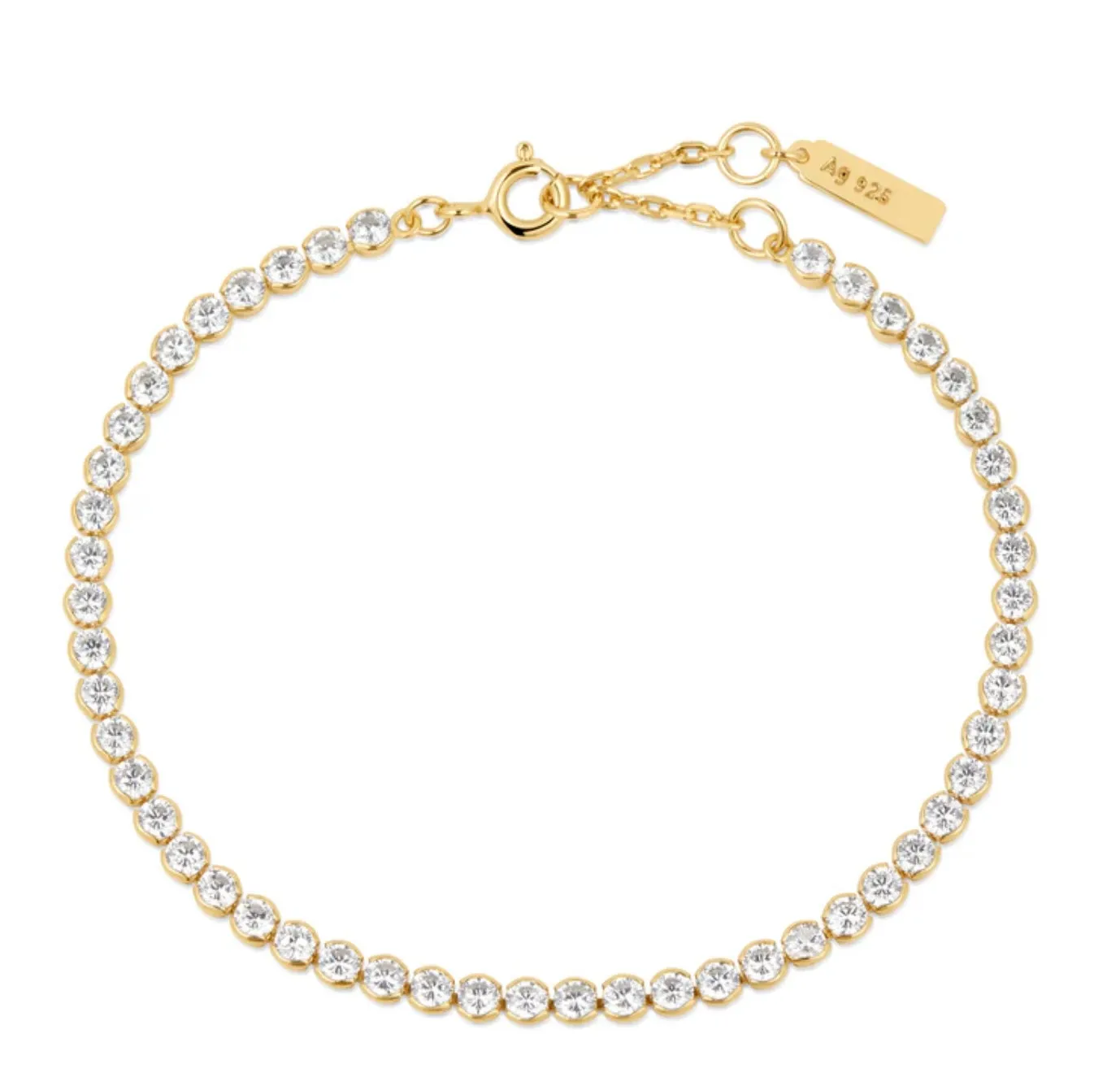 Decorated with a continuous line of clear cubic zirconia, this tennis bracelet in 14kt gold-plated sterling silver can be your sparkling must-have. Statement enough to be worn alone or stack it with other bracelets for a luxe, modern look.