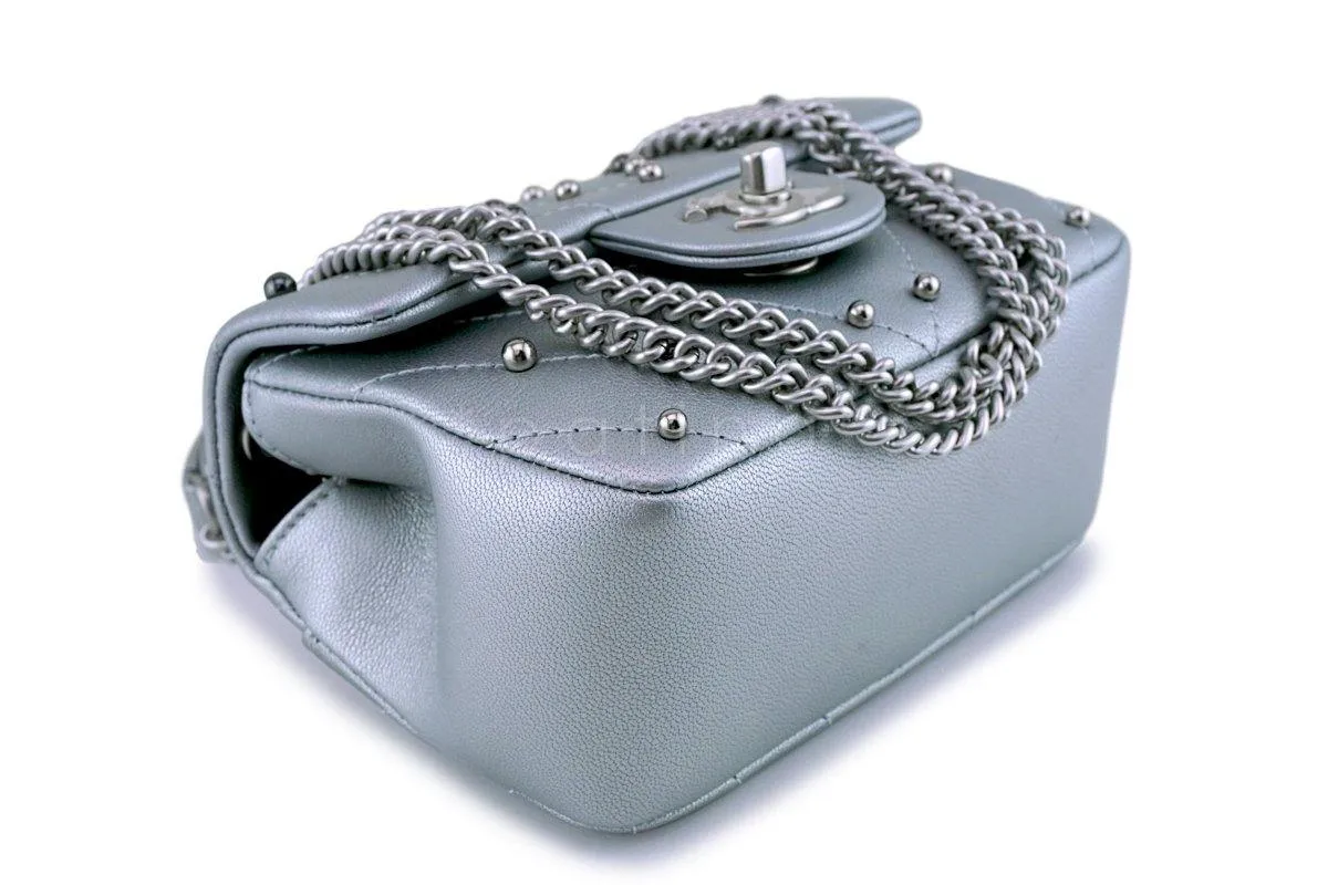 Signature Chanel quilted lambskin in pale silver Diagonal chevron quilting in addition to embellished silver and dark gray pearls Brushed silver hardware chain and CC turnlock clasp Interior lined in black canvas Back exterior pocket Measures 6.5in. W (at base) x 4.5in. H x 2.75in. D, strap drop is 23 inches Comes with Dust Bag, Authenticity Card, Box
