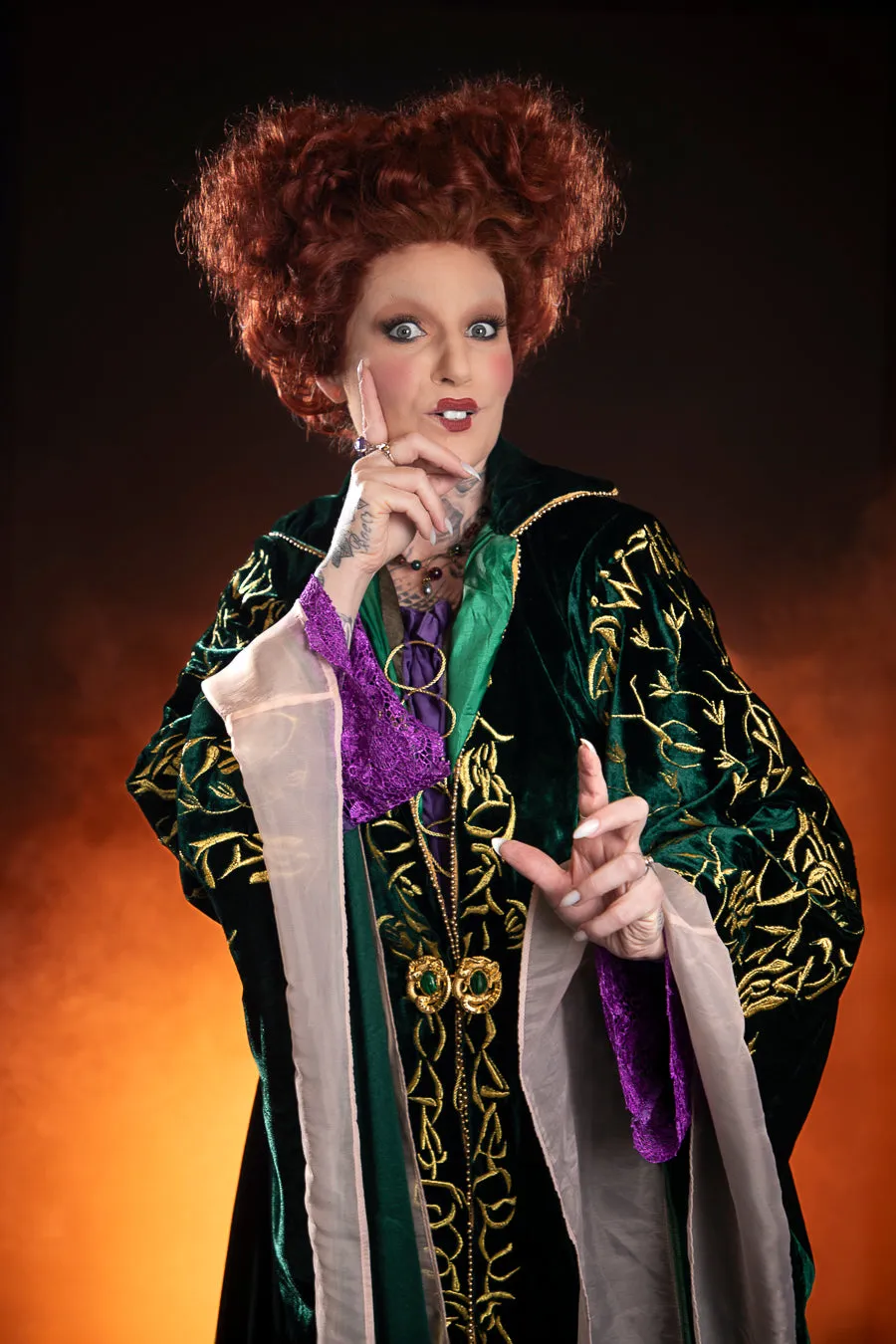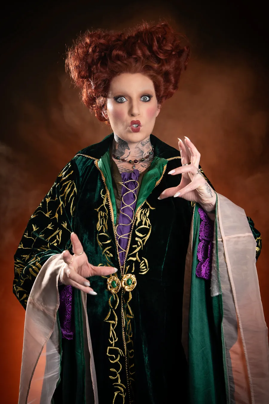 Exquisite replica costume from the iconic film, Hocus Pocus. Stunning and skillfully embroidered velvet cloak with draping sleeves, dress, brooches, custom styled lace front character wig and broomstick.