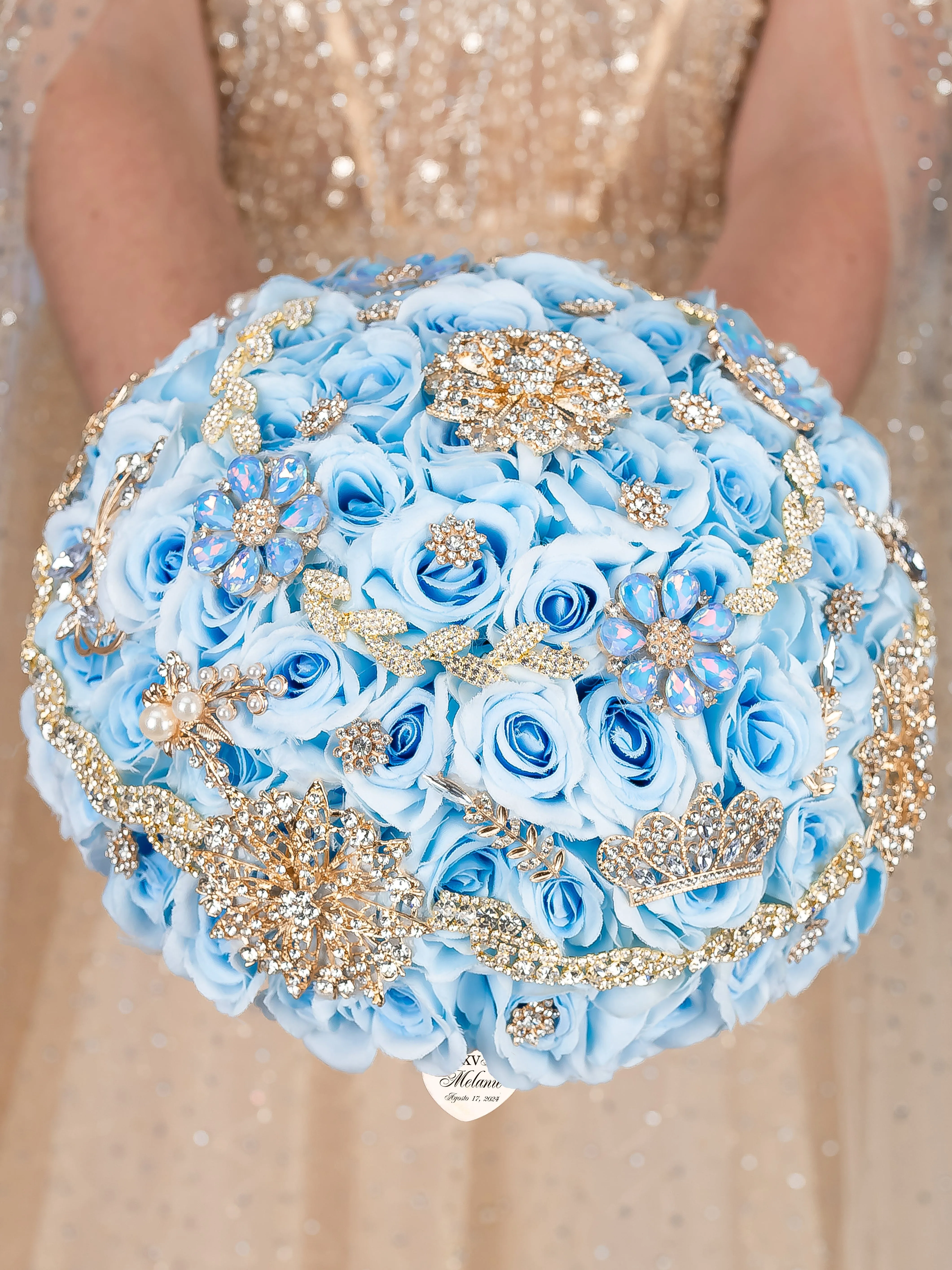 Behold the exquisite Quinceañera brooch bouquet in Light Blue Gold color!