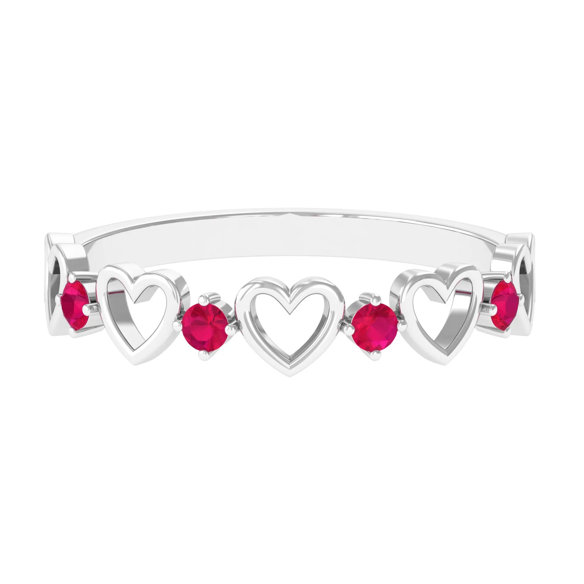 Experience the timeless charm of this Open Heart Half Eternity Ring adorned with Round Shape Ruby gemstones set in 4 Prong Diagonal Setting, a treasured symbol of your heartfelt connection and the love that fills your heart with joy.