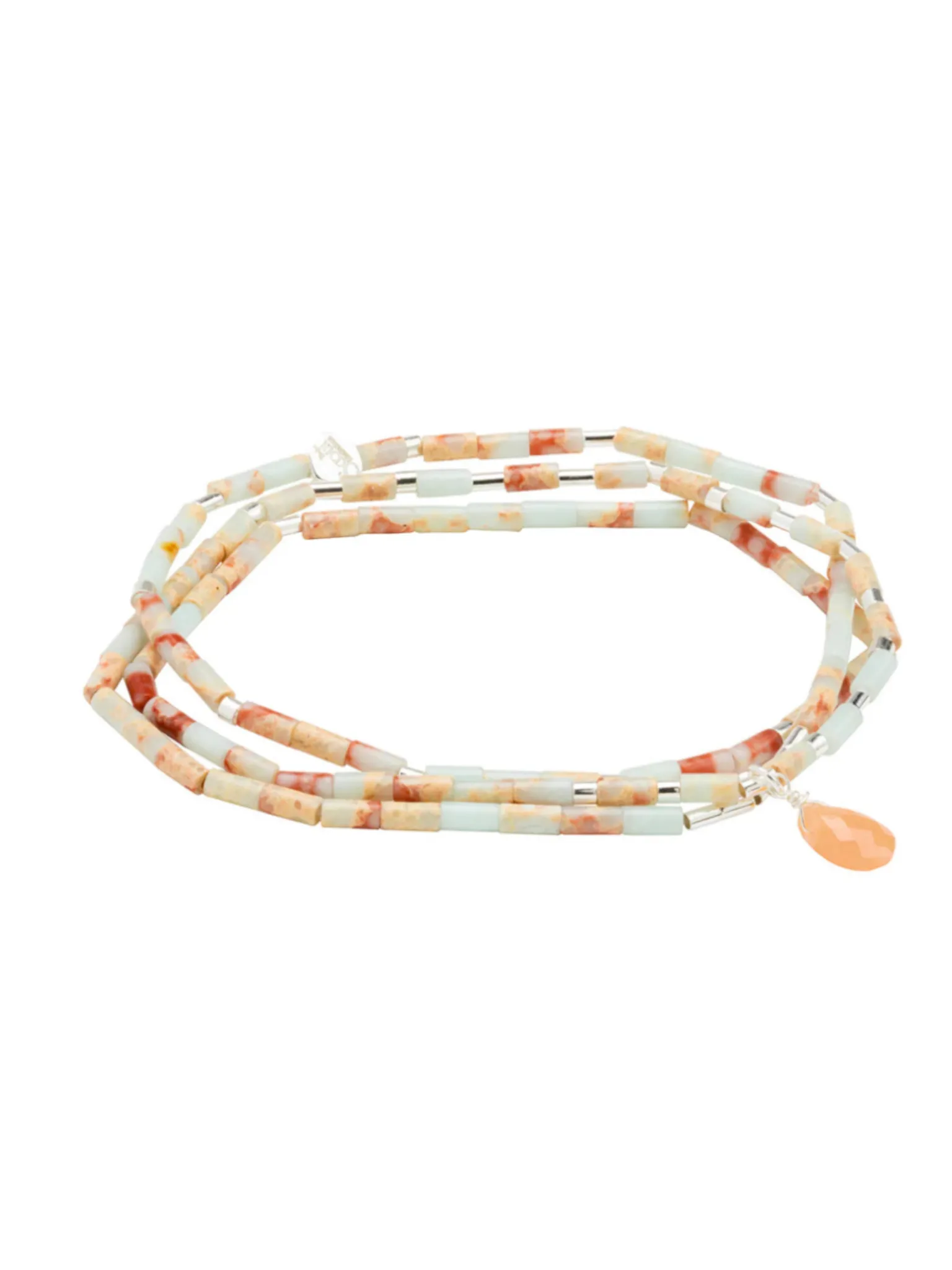 Cylindrical semi-precious stone beads and glittering metallic tubes are finished effortlessly with a faceted teardrop. Perfect for stacking and layering. Wear as a necklace or wrap as a bracelet.