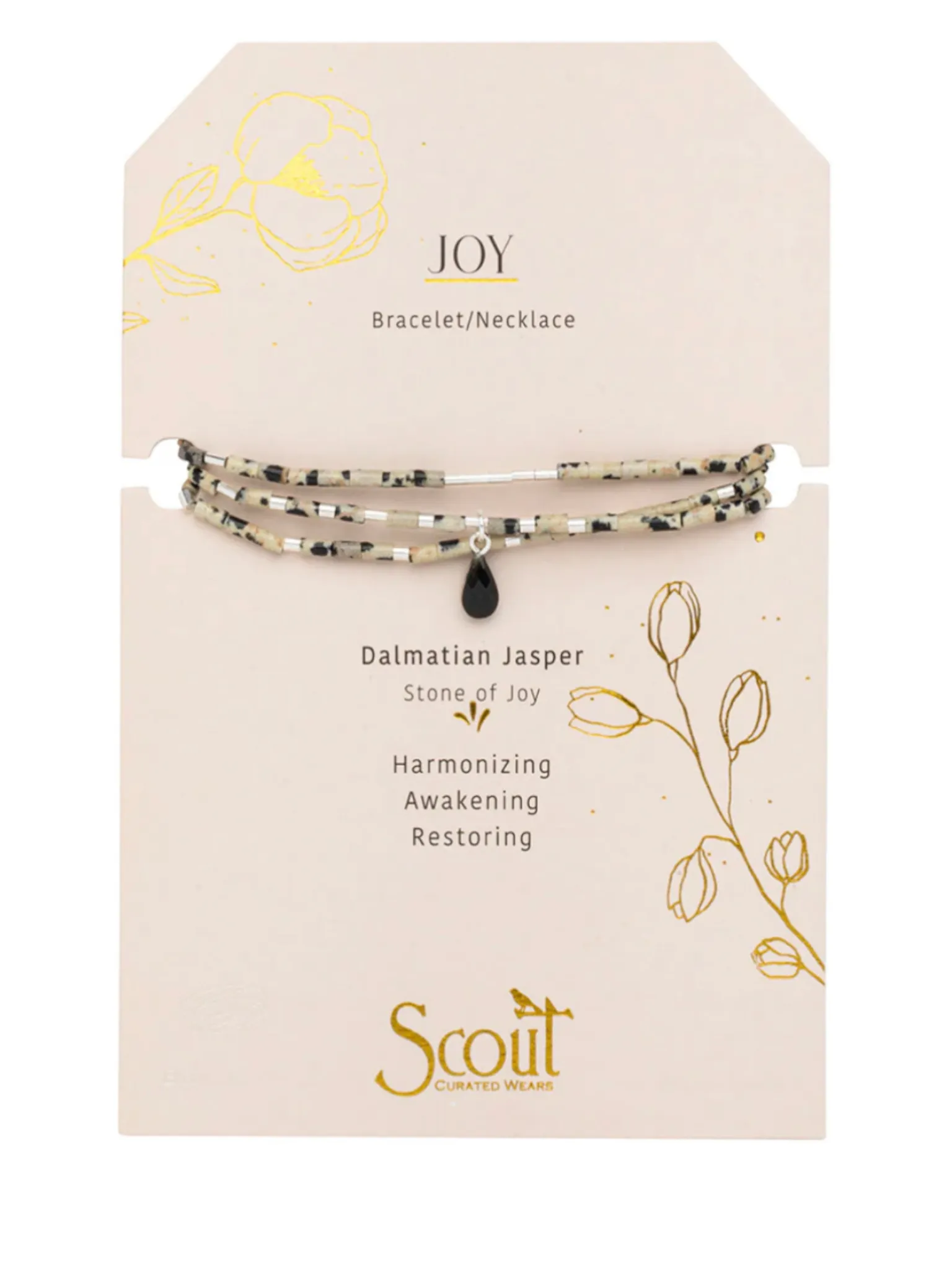 Cylindrical semi-precious stone beads and glittering metallic tubes are finished effortlessly with a faceted teardrop. Perfect for stacking and layering. Wear as a necklace or wrap as a bracelet.
