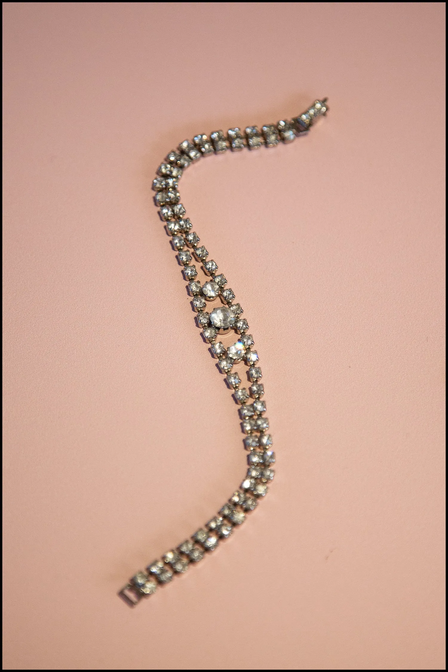 Original vintage 1950s clear crystal rhinestone bracelet with three round sparkling central stones mounted in silver tone claw settings. Fastens with a crystal snap lock.