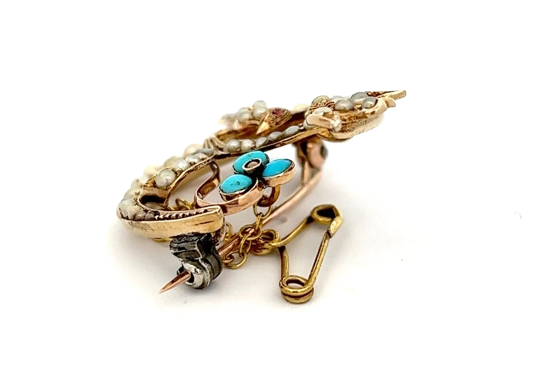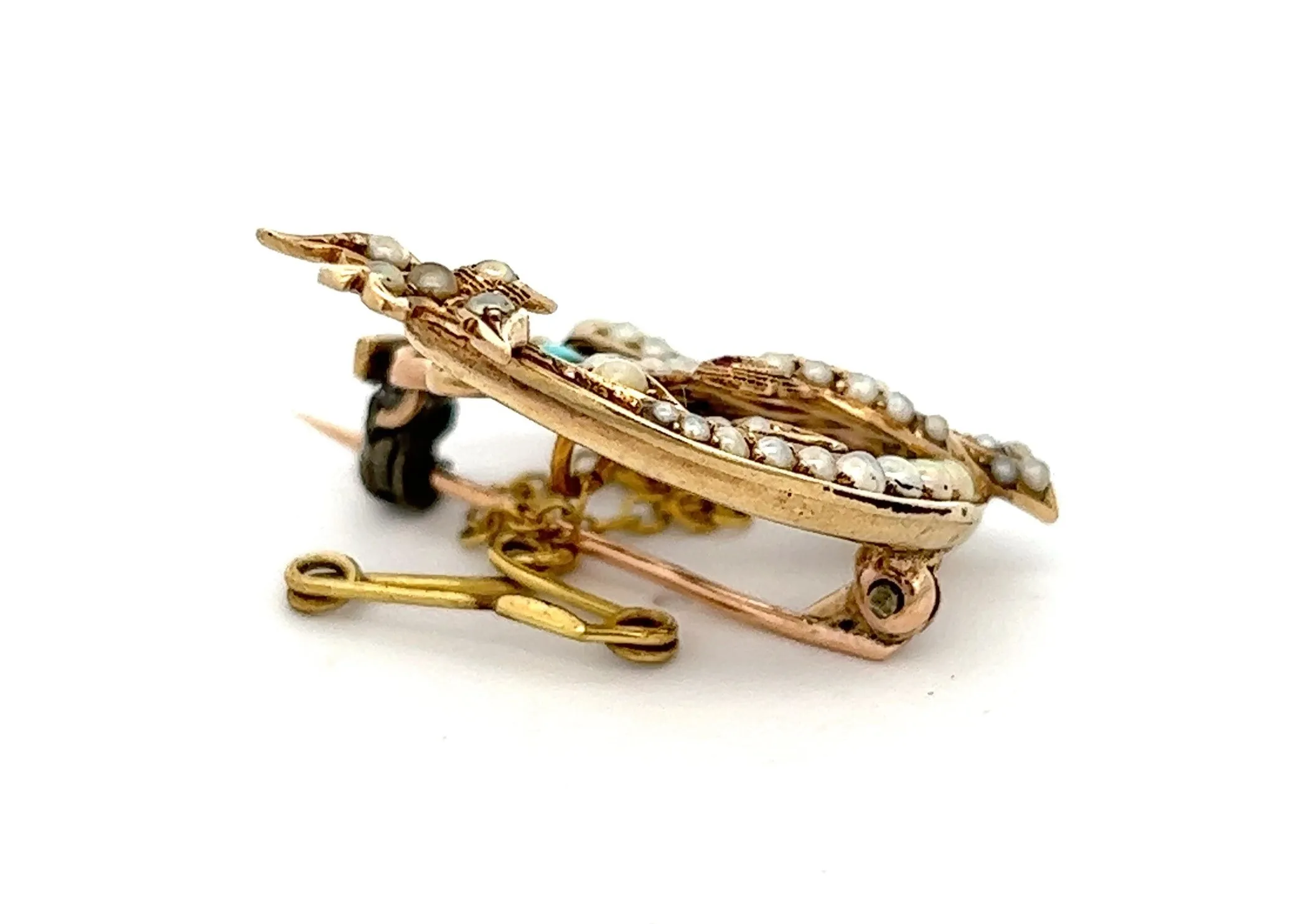 An exquisite 9ct yellow gold brooch featuring two birds sitting in a crescent surround and a flower in the centre. The brooch has Seed Pearls over the front and three turquoise gemstones as the petals on the flower. This brooch is vintage charm and beauty, its timeless style will make it a go to for special occasions.