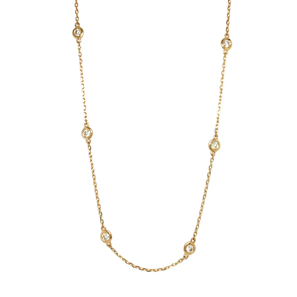 Shimmering 14K yellow gold is accented with glittering white diamonds in this beautiful, wearable station necklace. Simple but versatile, this elegant piece of jewelry will look great with any outfit!
